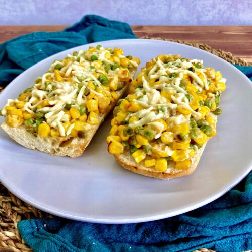 • Das Baguette halbieren und die Mais Erbsen Mischung auf jeder Hälfte verteilen.