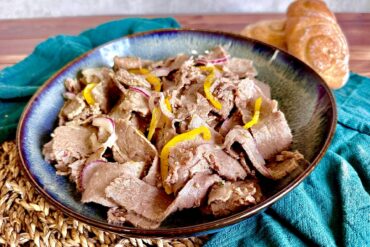 - Die Zwiebeln schälen und in Streifen schneiden.