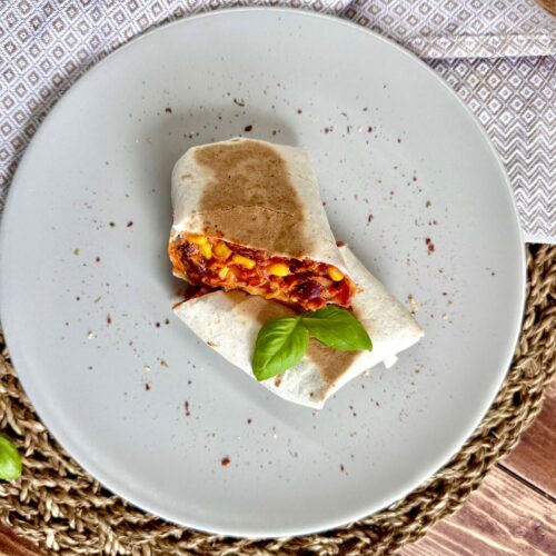 - Etwas Füllung auf die Teigtasche geben. Dann die geschmorten Paprika und den Käse darauf. Die Teigtasche seitlich auf beiden Seiten einschlagen und einrollen.
