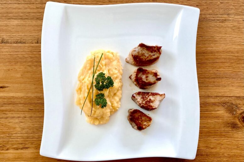 Gebratene Schweinefiletstücke mit Kartoffelpüree & Tomatenpesto
