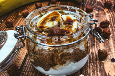 • Die Hälfte vom Frischkäse Joghurt ins Glas geben.