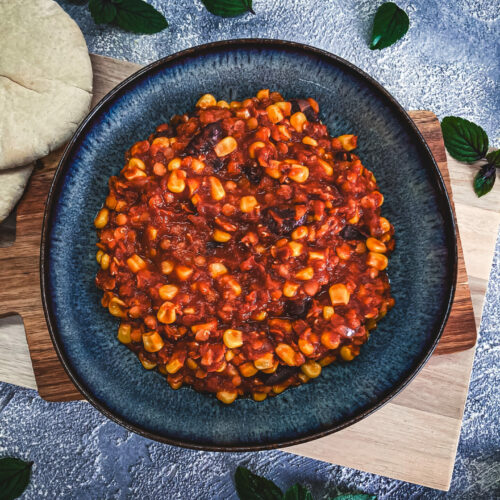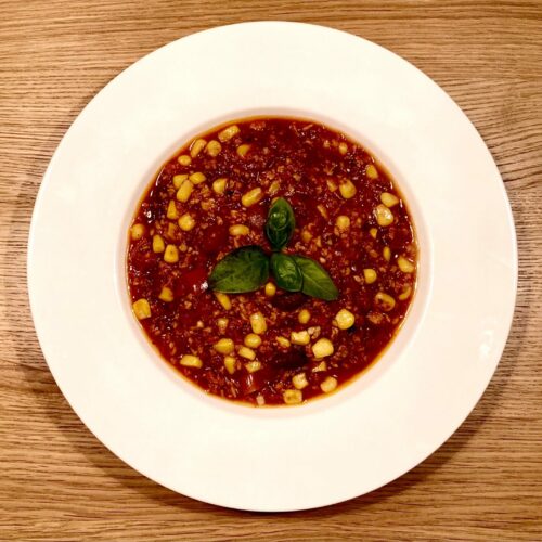 • Den Mais und die Bohnen abseihen, mit Wasser kurz abspülen und auch dazugeben.