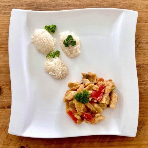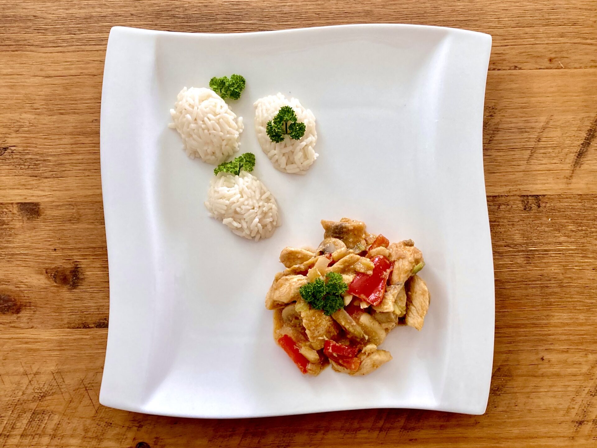 Chinesische Hühnchen-Gemüse-Pfanne mit Reis