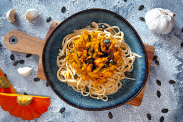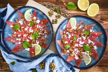 - In der Zwischenzeit die Butter in einer Pfanne schmelzen und dann den Honig darin schmelzen und kurz karamellisieren lassen. Die Walnüsse reingeben und noch kurz weiter karamellisieren. Alles auf einen Teller verteilen und auskühlen lassen.