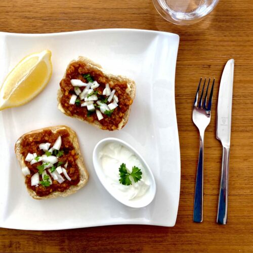 • Die Ciabattahälften mit Butter bestreichen, dann das grobe Püree darauf verteilen und die Zwiebelstücke und Petersilie draufstreuen.