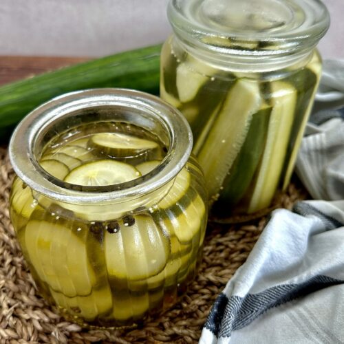 - Die Salatgurken in Scheiben oder Streifen schneiden und diese in Gläser schlichten. (Am besten in Gläser mit Schraubverschluss!)