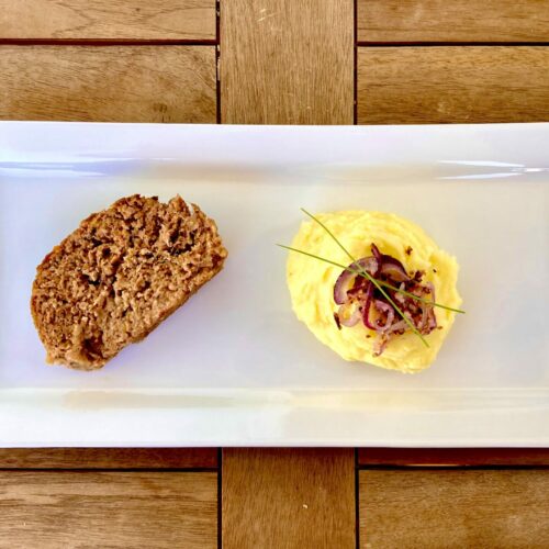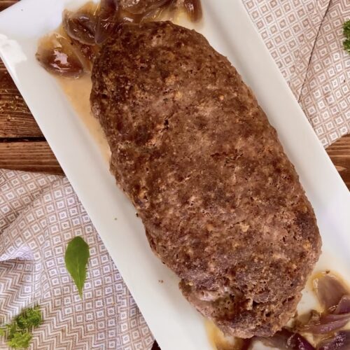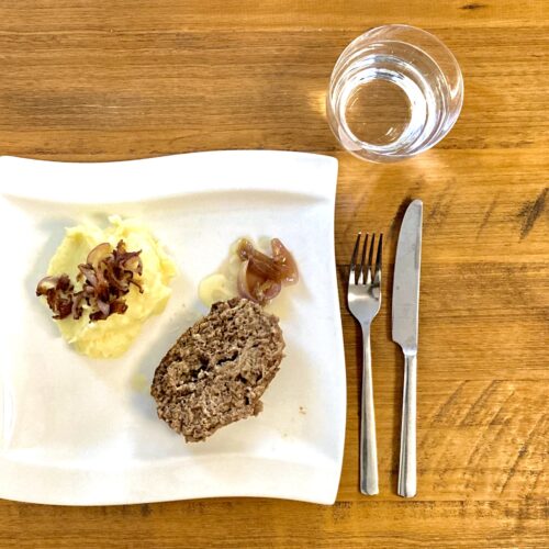 Faschierter Braten mit Kartoffelpüree und gerösteten Zwiebeln