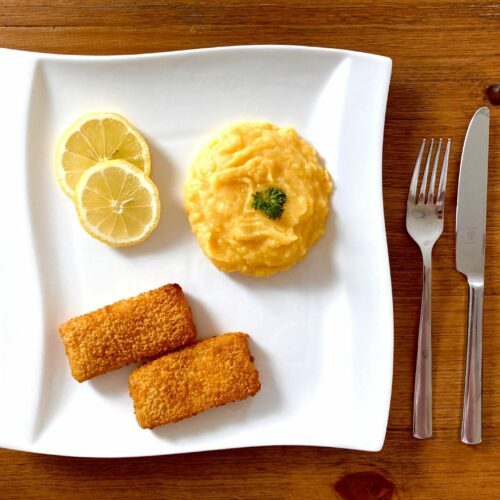 Fischstäbchen mit Kürbis-Kartoffelpüree