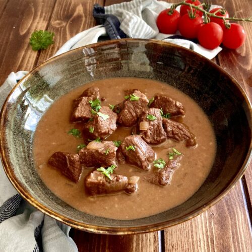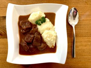 • Rotwein, 600 ml Wasser, Suppenwürfel, Tomatenpaste und Gewürze dazugeben, Deckel drauf und 30 Minuten köcheln lassen.