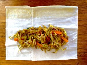 • Die Gemüsefüllung auf die Teigblätter verteilen und diese auf einer Seite mit Ei bestreichen.