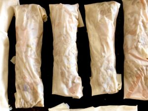 • In der Zwischenzeit die Teigblätter in Stücke schneiden und ein Ei verquirlen.
