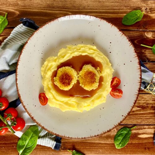 Gebratene Hirse-Bällchen mit Bratensoße und Kartoffelpüree
