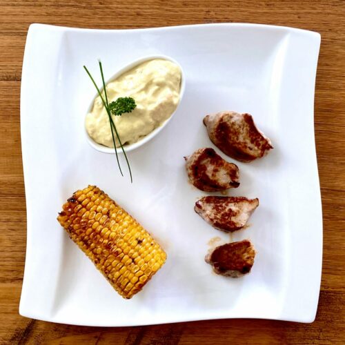 Gebratene Schweinefiletstücke mit Maiskolben und süßer Currysoße