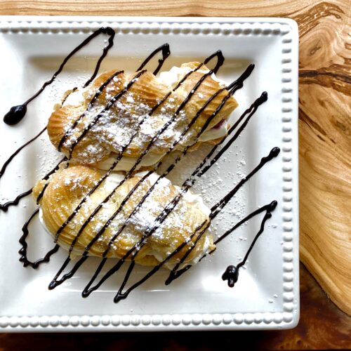 - Danach mit Schlagobers füllen und obendrauf die flüssige Schokolade draufgeben.