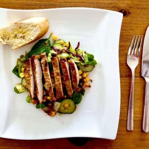 - Das Grillfleisch vom Vortag aufwärmen oder die Schweinekoteletts in einer Pfanne scharf anbraten.