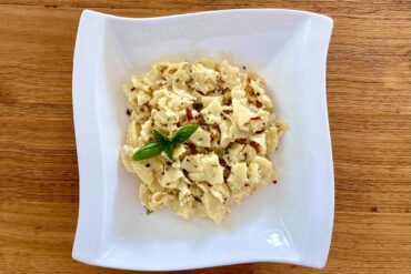 • Die Ei-Mischung drüberleeren und immer wieder Rühren, bis das Ei stockt.