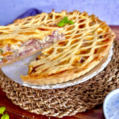 - Eine Arbeitsfläche mit Mehl bestreuen und den Teig ausrollen. Dann den Teig in die Tarte Form legen und außen den Rand mit dem Finger „abdrücken“, damit dieser genau in die Form passt. Aus dem restlichen Teig kann man Streifen oder Ähnliches für oben drauf formen.
