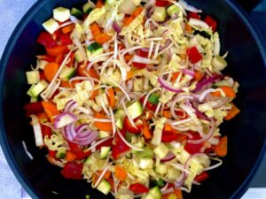 • In der Zwischenzeit das ganze Gemüse in mundgerechte Stücke schneiden.