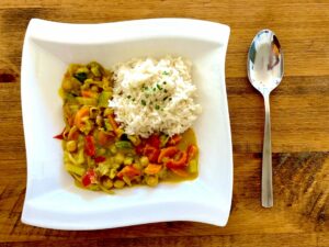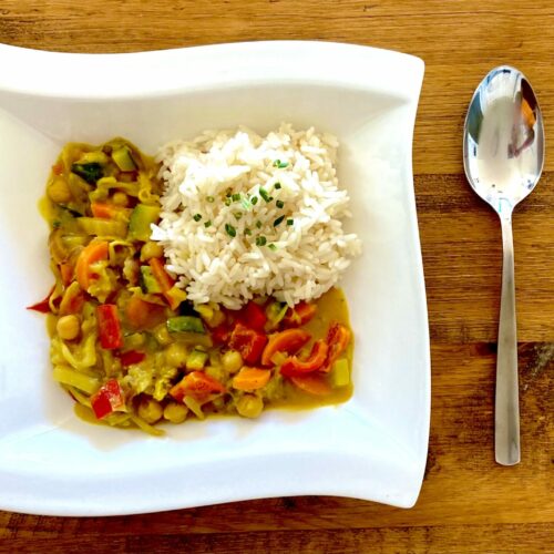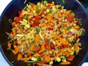 • Das Gemüse (außer die Kichererbsen) in etwas Olivenöl ca. 10 Minuten anbraten.