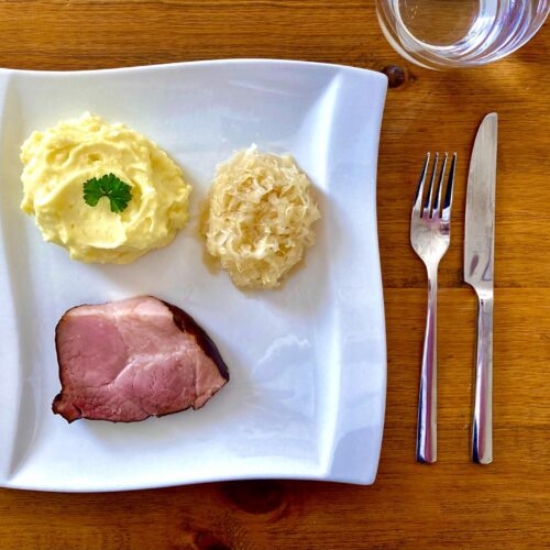 Geselchtes mit Kartoffelpüree und Sauerkraut