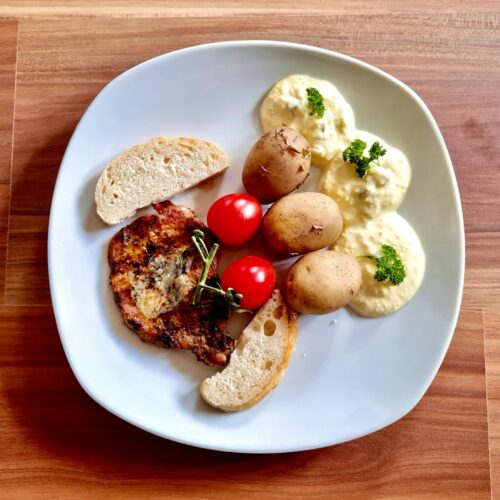 Grillfleisch mit Kartoffeln und süßer Currysoße