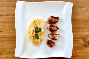 • Das Grillfleisch entweder aufwärmen oder in einer Pfanne in etwas Olivenöl anbraten.