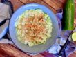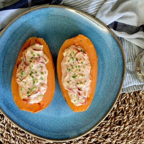 • Die Süßkartoffelstücke vom Aushöhlen werden zur Fülle gegeben und dann füllt man alles in die Mulde der Süßkartoffeln.