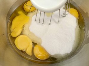 • Zuerst die Eier mit dem Zucker schaumig aufschlagen.
