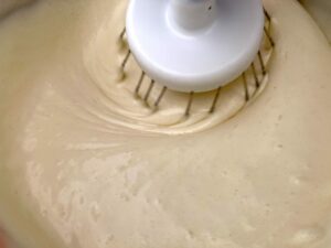 • Mehl und Backpulver vermischen und abwechselnd mit der Milch unter ständigem Rühren zur restlichen Masse mischen.