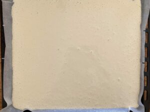 • Die ganze Masse auf ein mit Backpapier ausgelegtes Backblech leeren und gleichmäßig verteilen.