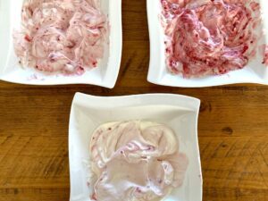 • Die Creme in drei Teile aufteilen und überall einen Teil der Himbeeren untermischen. (In drei unterschiedlichen Farbtönen)