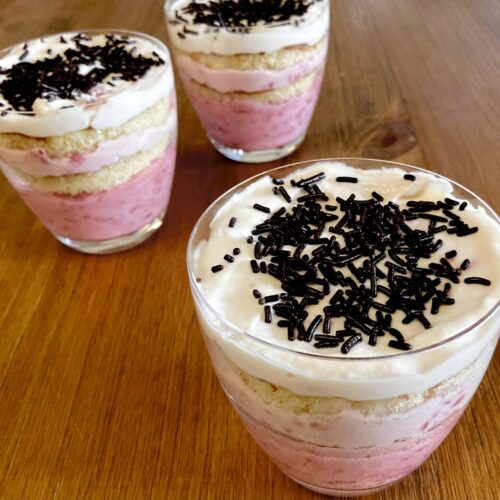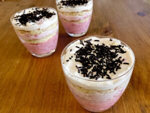 (Da der Teig für ein ganzes Blech ist und wir hier nur 4 Gläser machen, wird Teig übrigbleiben. Diesen Teig kann man einfach auch in Ringe ausstechen und diese dann einfrieren. Wenn man das nächste Mal so ein Dessert zubereitet, muss man den Kuchen nicht mehr zubereiten, sondern nur die Teigringe auftauen.)