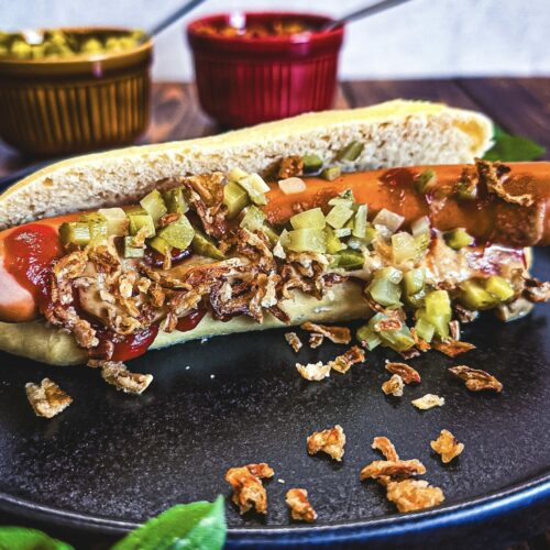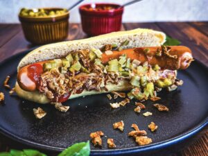- Das Hot Dog Brötchen aufschneiden und wie folgt belegen: Frankfurter, Sauerkraut, Essiggurken, Ketchup, Senf und obendrauf die Röstzwiebeln.