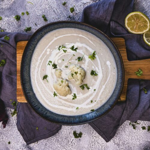• Wasser und Suppenwürfel dazugeben und mit Deckel kochen lassen, bis der Karfiol weich ist.