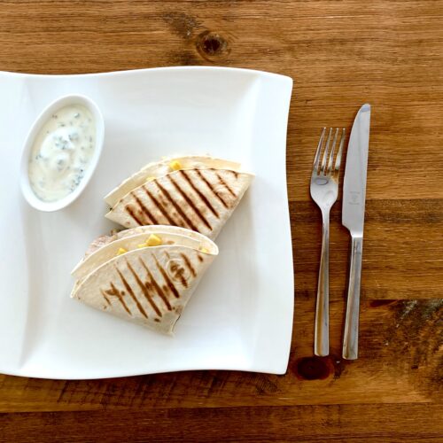- Dann wie auf den Bildern ersichtlich das Fleisch, den Mais, den Blattspinat und den Käse auf die Ecken der Teigtasche verteilen.
