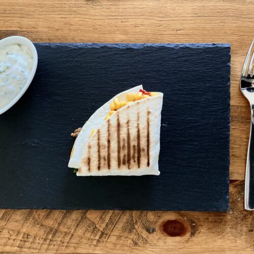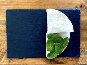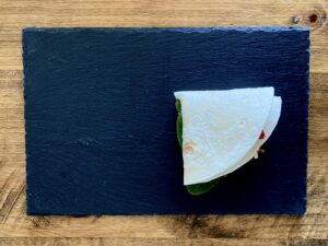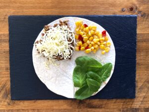 - Dann wie auf den Bildern ersichtlich das Fleisch, den Mais, den Blattspinat und den Käse auf die Ecken der Teigtasche verteilen.