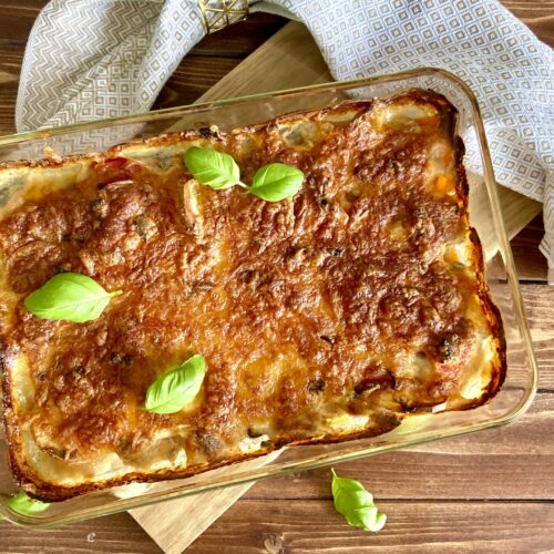 - Dann den Käse obendrauf streuen und nochmal ca. 20 Minuten ins Backrohr geben, damit die Kruste entsteht.