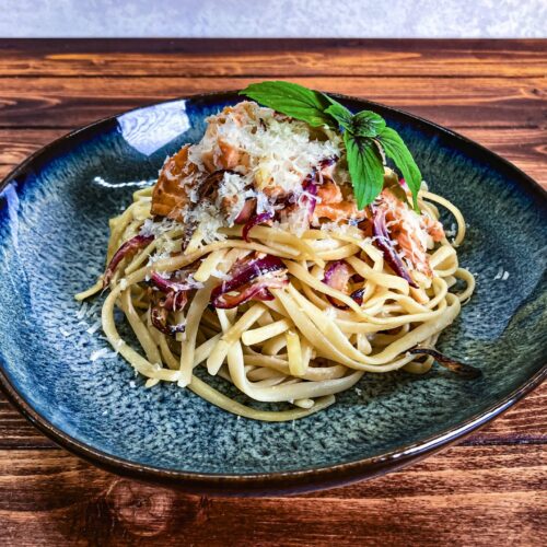 - Den Zwiebel dazugeben und mit dem Lachs anbraten.
