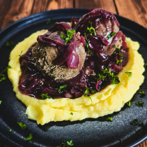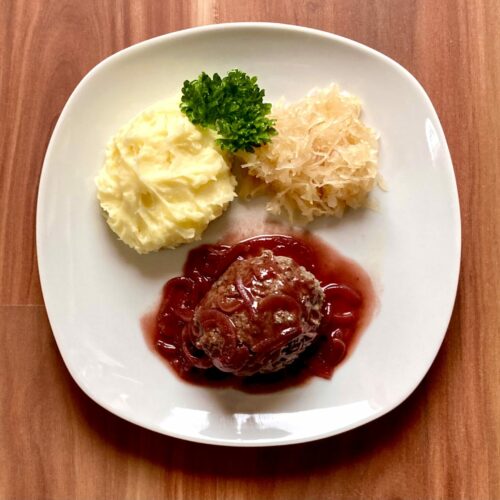 Leberknödel mit Zwiebelsoße, Kartoffelpüree und Sauerkraut