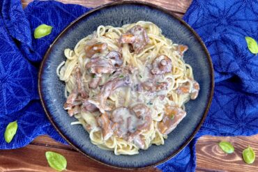 - In der Zwischenzeit die Zwiebeln schälen und in Streifen schneiden.