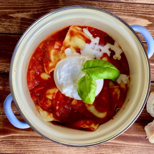 Mit Pilzen gefüllte Tortellini in Tomatensoße mit Trüffel-Büffelmozzarella