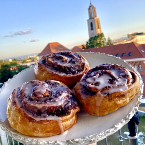• Die Zuckerglasur auf die Nussschnecken streichen.