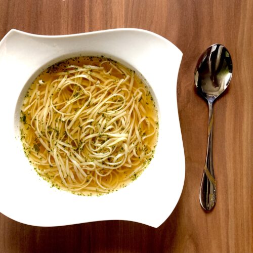 Wenn man die Nudeln separat kocht, kann man die Suppe auch einfach aufbewahren bis zum nächsten Tag oder sogar einfrieren. Wenn man die Nudeln in der Suppe kocht und dort lässt, saugen sie sich immer mehr mit Suppe an und schmecken nicht mehr so gut. 😀