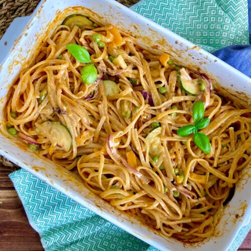 - Eine Auflaufform einfetten und die ungekochten Nudeln hinein geben.
