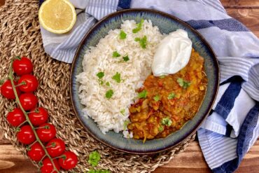 - Das Gemüse, alle Flüssigkeiten und die Gewürze dazu.