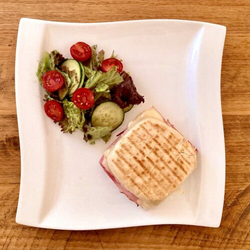 Panini mit Schinken-Käse-Füllung und gemischten Salat