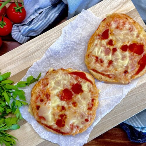 - Die Teigteile mit Tomatensoße bestreichen und mit Käse belegen.