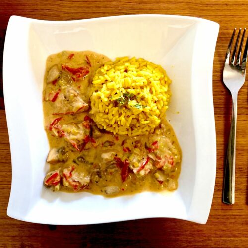 Kurz bevor das ganze Wasser vom Reis verkocht ist, werden ca. 3 Teelöffel vom Currypulver hinzugefügt und dann wird der Reis fertig gekocht.