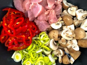 • In der Zwischenzeit Frühlingszwiebeln, Champignons, Paprika und Putenfleischstücke in etwas Öl in einer Pfanne anbraten und würzen.