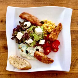 Man kann das Putenfleisch einfach durch Grillkäse ersetzen und schon ist es ein vegetarisches Gericht. 🙂